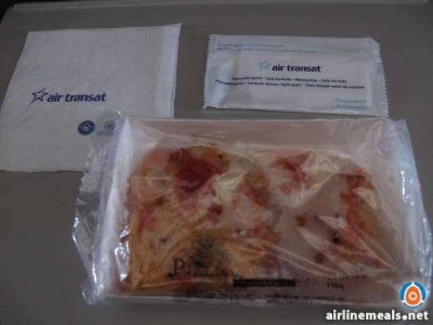 Esta pizza servida pela Air Transat em uma viagem entre o Canadá e a Alemanha