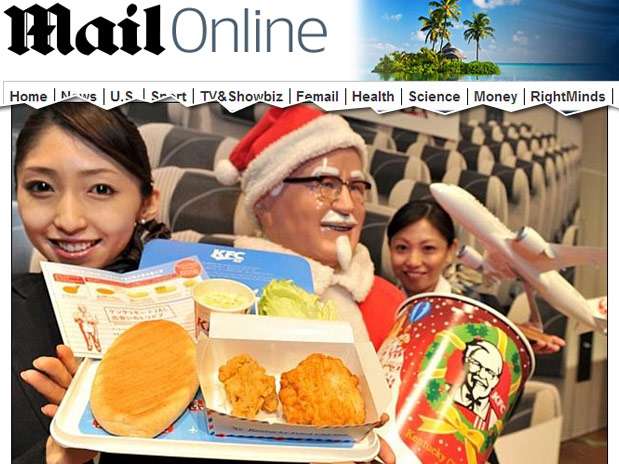 A Japan Airlines irá servir Kentucky Fried Chicken (KFC) para os passageiros de alguns voos para a Europa e para os Estados Unidos nos próximos três meses. As informações são do jornal Daily Mail.