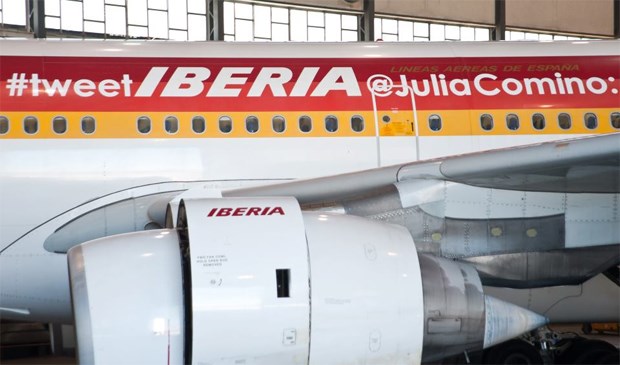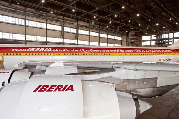 É o resultado de uma ação de promoção para se aproximar dos jovens: a companhia aérea espanhola Iberia pintou num avião, em letras garrafais, uma mensagem escrita no Twitter por uma das suas seguidoras.