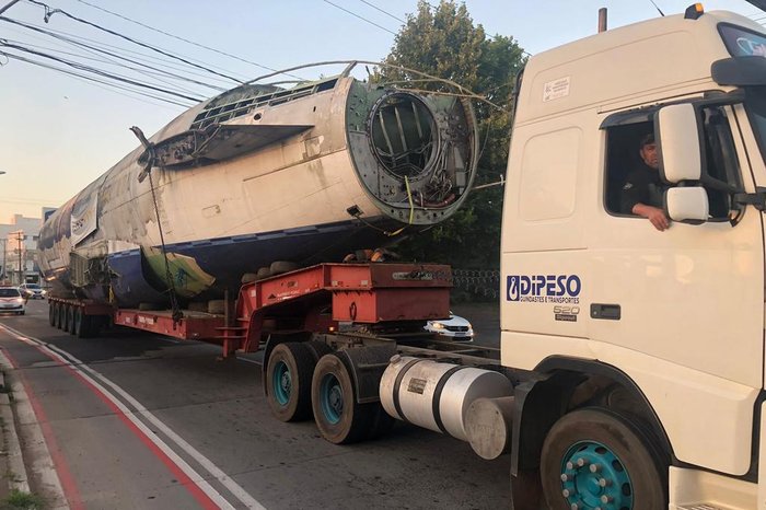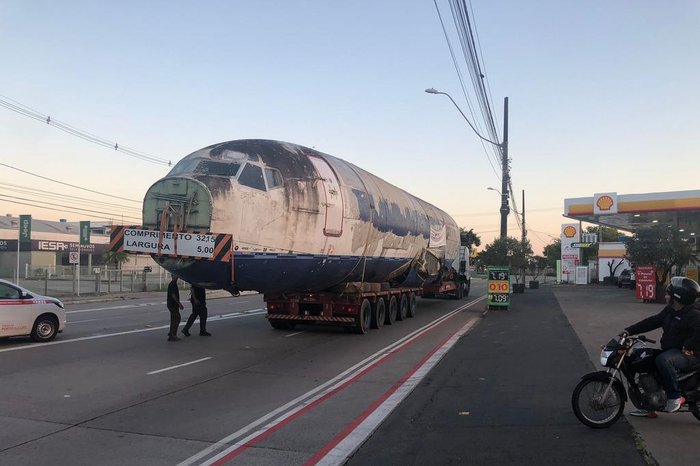 O avião está em cima de um caminhão, escoltado por dois veículos. Ao passar pela Rua Edu Chaves, em Porto Alegre, foi fotografado por pedestres e motoristas. A estrutura tem 32 metros de comprimento e cinco metros de largura.