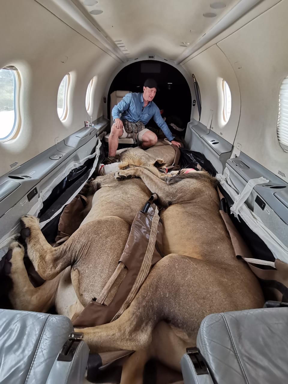 O piloto Menno Parsons voou com os três leões da Reserva Khamab Kalahari para a Reserva de Caça de Mabula, e o Dr. Andy Fraser foi responsável pelo lançamento e monitoramento dos leões.