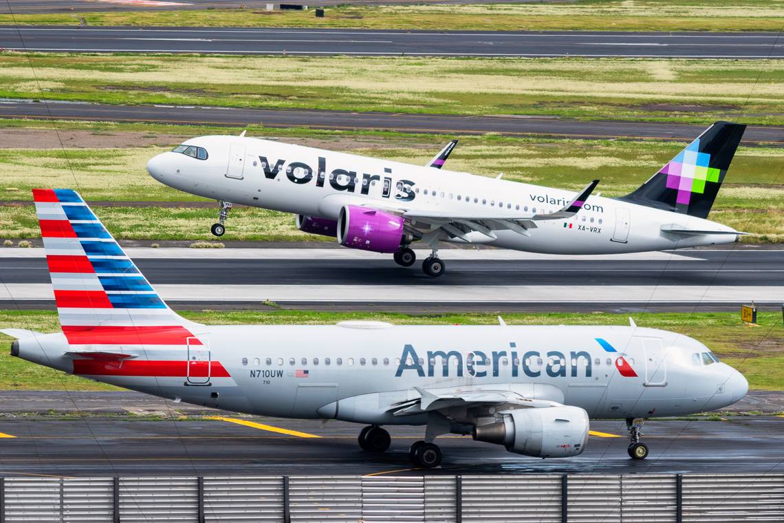 | A companhia aérea Volaris (em terra) e a Aeromexico Airlines partem; ambas as aeronaves mexicanas no aeroporto internacional de Tijuana (Foto: Shutterstock) |