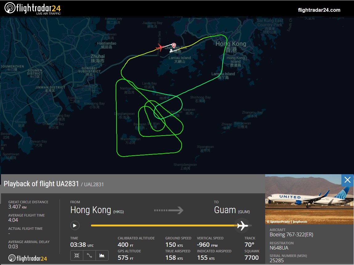 Nesta terça-feira (20), o Boeing 767-322ER, prefixo N648UA, da United Airlines, que realizava o voo UA2831, entre Hong Kong e Guam, na China, sofreu uma oscilação do motor nº 2 durante a decolagem da pista 07R no Aeroporto Internacional de Hong Kong-Chek Lap Kok (HKG/VHHH).