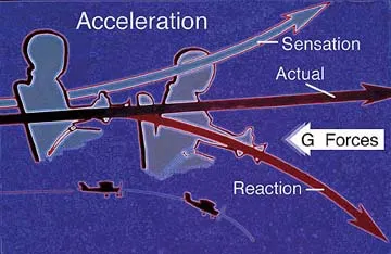 No entanto, o cérebro humano tende a interpretar essa sensação como sendo causada pela gravidade, independentemente de ser esse o caso, dando origem à ilusão somatogravica - a crença de que alguém está subindo quando na verdade está acelerando. Essa sensação pode ser suprimida orientando-se em relação a referências visuais, mas se não houver referências visuais - por exemplo, em uma noite sem lua sobre a água - então a ilusão é extremamente poderosa.
