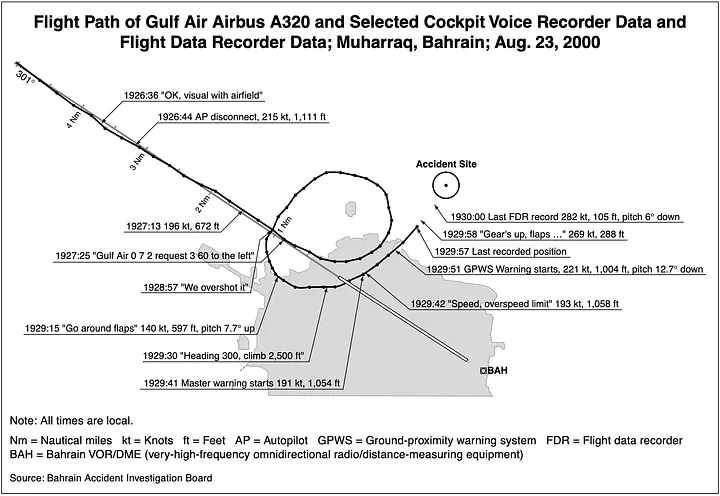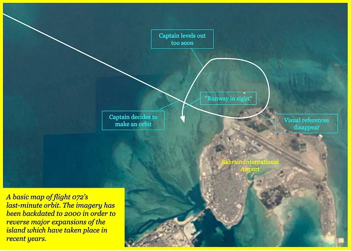 Quando a comissão de inquérito recuperou as caixas-pretas do fundo do mar raso no Bahrein, elas revelaram uma aproximação irremediavelmente instável desde o início, pois os pilotos seguiram em direção à pista, embora não estivessem devidamente alinhados para pousar.