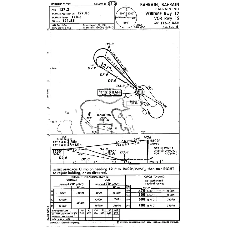 | A carta de aproximação utilizada pela tripulação mostra os detalhes da aproximação VOR/DME para a pista 12, para quem tem habilidade e vontade de aprender mais (Imagem: Bahrein AIB) |
