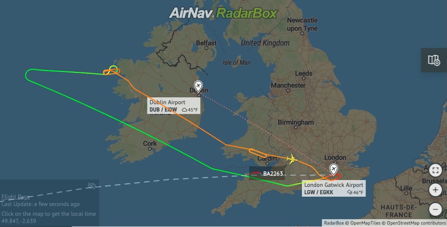 Após sobrevoar a Irlanda, após quase 2 horas de voo, a tripulação decidiu dar meia volta e circulou a oeste da Irlanda para escolher a melhor opção.