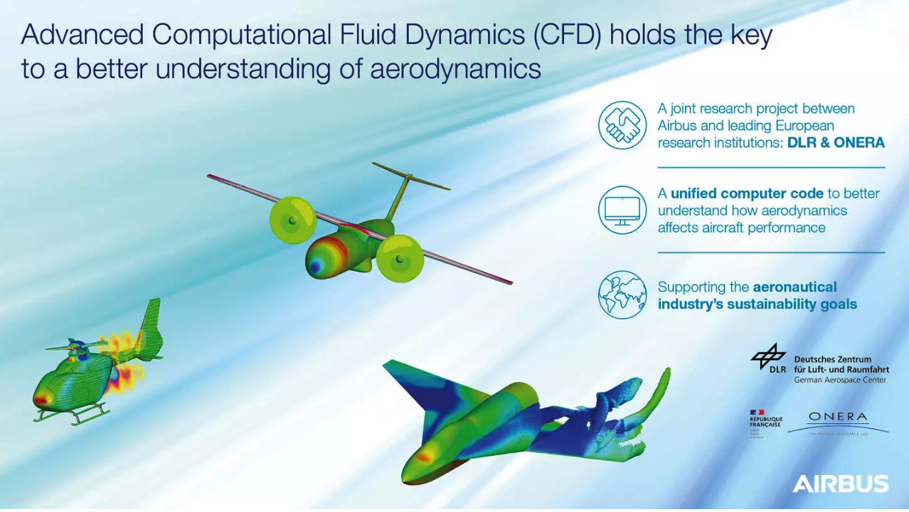 O CFD simula fluxos de fluidos e, em seguida, produz previsões quantitativas dos fenômenos de fluxo, utilizando uma combinação de matemática, física e algoritmos de computador de alto desempenho. A Airbus está em parceria com o Centro Aeroespacial Alemão (DLR) e o Office National d'Etudes et de Recherches Aérospatiales (ONERA) para explorar como a abordagem pode ajudar a informar a aerodinâmica e aumentar a eficiência.
