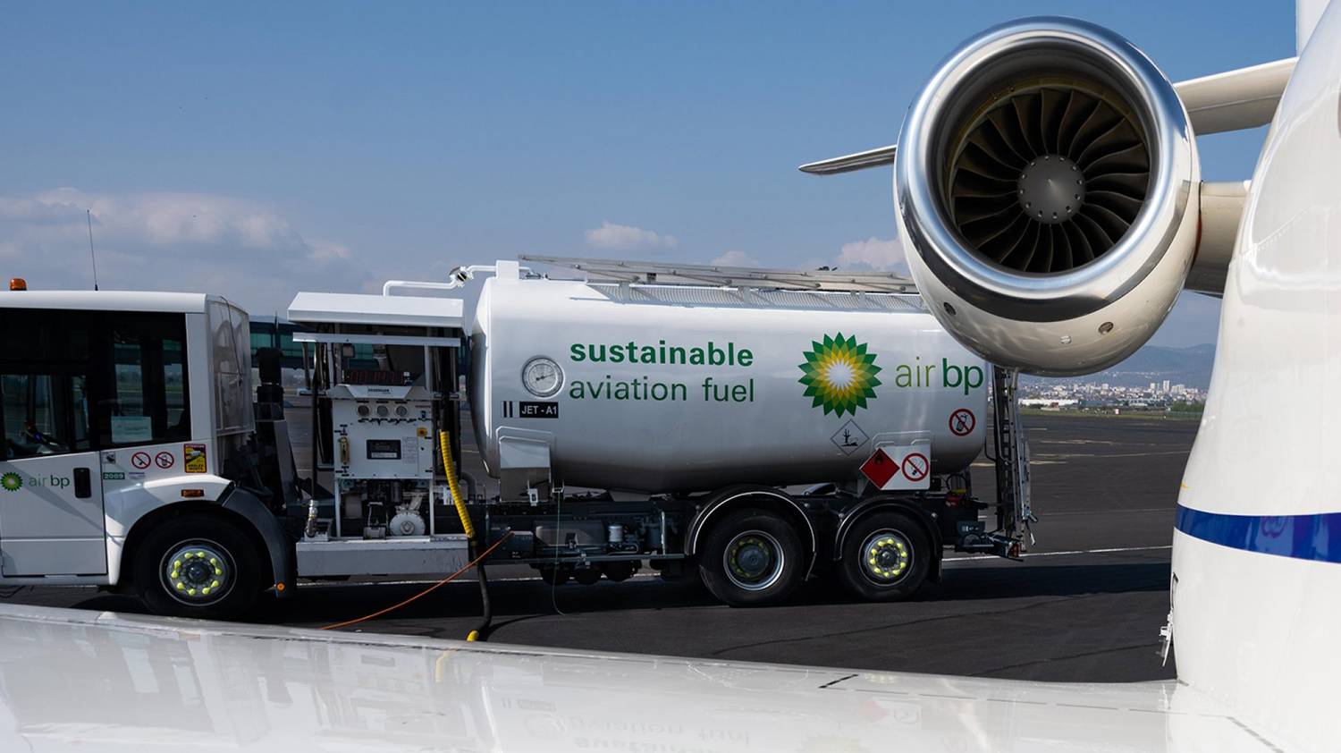 | Um veículo de combustível de aviação sustentável ao lado de um avião (Foto: British Petroleum) |