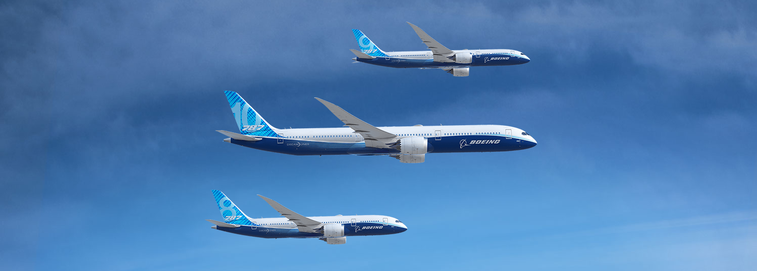 | Os Boeings 787 -8, -9 e -10 voando em formação (Foto: Boeing) |