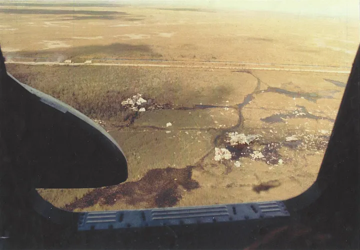 Segundos depois, uma enorme explosão surgiu do pântano, lançando uma parede de fogo de 30 metros de altura que parecia continuar por quase um quilômetro. Embora as chamas tenham diminuído rapidamente, eles conseguiram identificar o local do acidente e correram para o local em seu aerobarco, percebendo que haviam chegado apenas quando sua proa bateu contra uma massa escura de destroços.