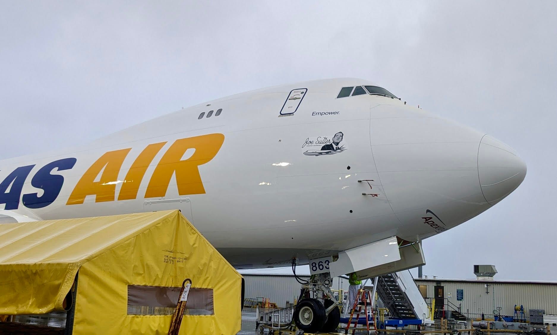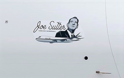 O decalque "Joe Sutter forever amazing" está no último Boeing 747 fabricado (Foto via @willtaylor787)