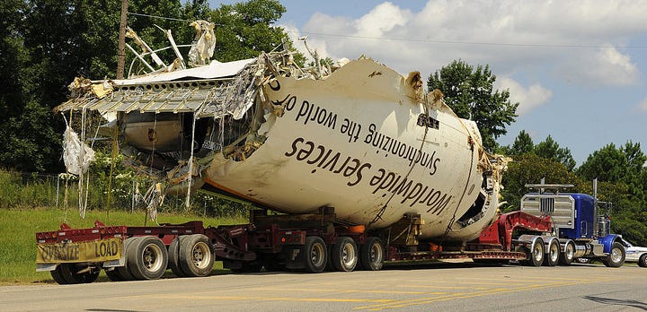 A cabine do voo 1354 é carregada em um caminhão-plataforma para remoção do local (Foto: Joe Songer)