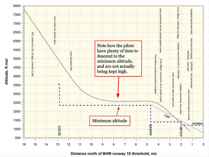 Foi interessante notar que em nenhum momento o ATC os deixou muito altos. O controlador realmente os liberou para 200 pés da altitude mínima local bem antes de atingir o ponto de aproximação final em BASKN. Depois de se alinharem com o localizador, eles tiveram muito tempo para descer até essa altitude mínima, mas nunca o fizeram, mesmo quando o capitão Beal continuou reclamando de ter sido deixado no alto. Essa fixação em estar muito alto desempenharia um papel pequeno, mas possivelmente crítico, posteriormente na sequência de eventos.