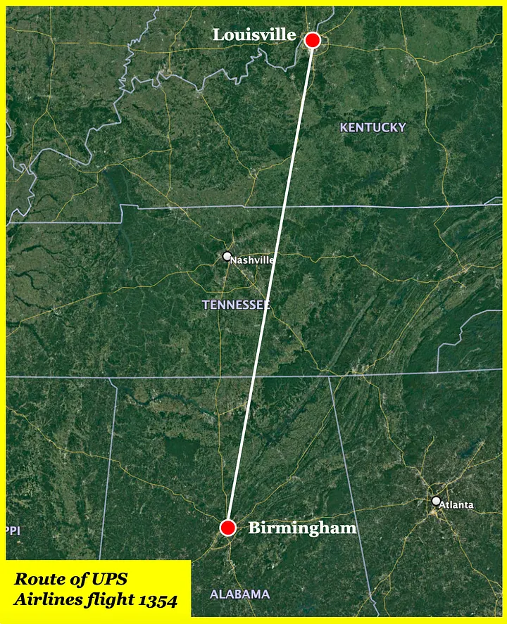 O voo 1354 da UPS decolou de Louisville às 4h03, rumo ao sul em direção ao Alabama. O avião praticamente voou sozinho, pois a tripulação já havia ativado o piloto automático para seguir uma rota pré-programada diretamente para o ponto de referência KBHM no Aeroporto Internacional de Birmingham-Shuttlesworth.