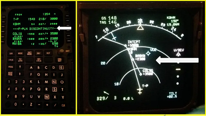 Após isso, ninguém notou inúmeras pistas de que existia uma descontinuidade no plano de voo, incluindo a linha estranha e uma distância incorreta para o aeroporto em seus monitores de navegação, as estranhas indicações em seus VDIs, a mensagem “F PLN DISCONTINUITY” em seus monitores FMC, e vários outros itens.
