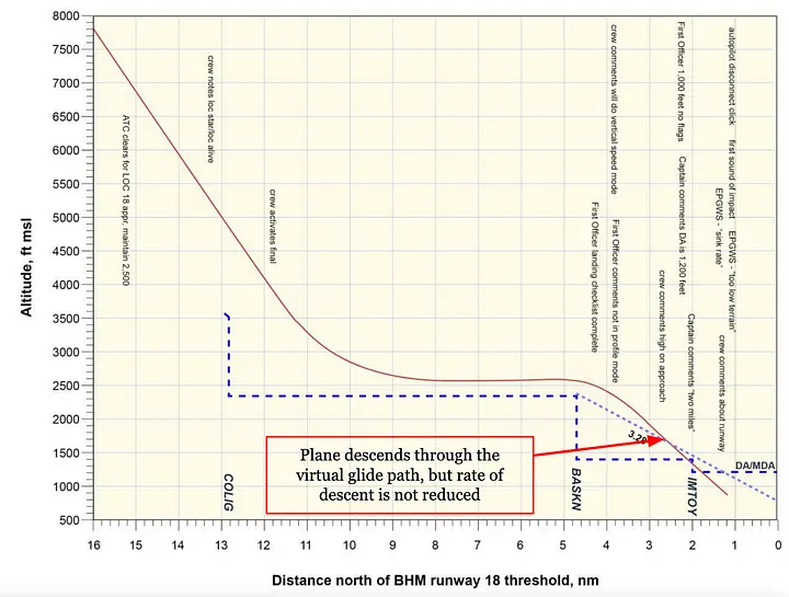 Em particular, ele perdeu uma indicação muito estranha. Naquela época, os Indicadores de Desvio Vertical (VDIs) de ambos os pilotos, que mostram a localização da trajetória de planeio virtual em relação ao avião, os mostravam o mais abaixo possível da trajetória de planeio. Isso ocorreu porque a distância calculada restante até a pista incluía a perna descontínua para KBHM; portanto, acreditando que os pilotos tinham muito mais tempo para voar do que realmente voavam, o FCM também acreditava que eles deveriam estar muito mais altos do que estavam. E assim os VDIs os mostraram bem abaixo do caminho de planeio no momento em que sabiam que estavam acima dele. No entanto, ninguém apontou esse sinal óbvio de que algo estava errado.