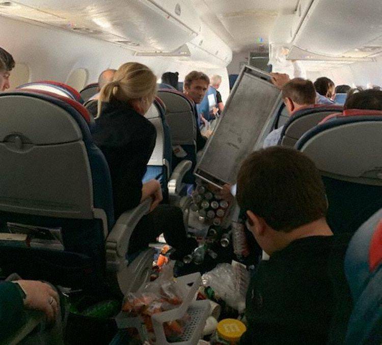 Um funcionário da United Airlines disse que a força das pessoas que atingiram o teto do avião deixou vários amassados grandes. “O avião desceu repentinamente enquanto um atendente entregava refeições e as máscaras de oxigênio caíram e a comida foi espalhada por toda parte”, disse Joji Hara.