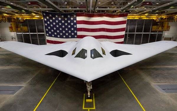 | Um B-21 Raider é revelado com uma bandeira dos EUA ao fundo (Foto: Serviço de Distribuição de Informações Visuais de Defesa) |