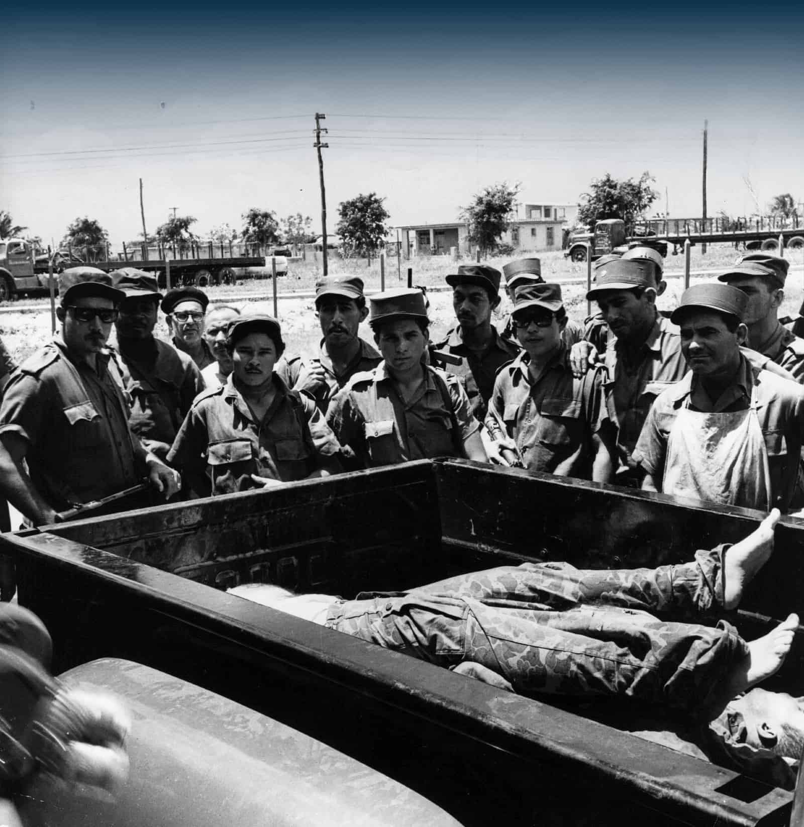 | Milícia cubana com um corpo. É difícil saber o número exato de mortes do lado invasor |