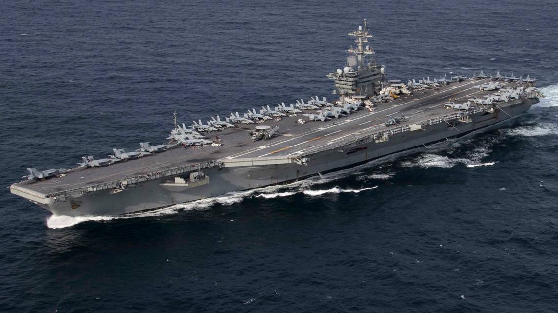 | O USS Abraham Lincoln flutuando na água com muitos caças no convés (Foto: Marinha dos EUA) |