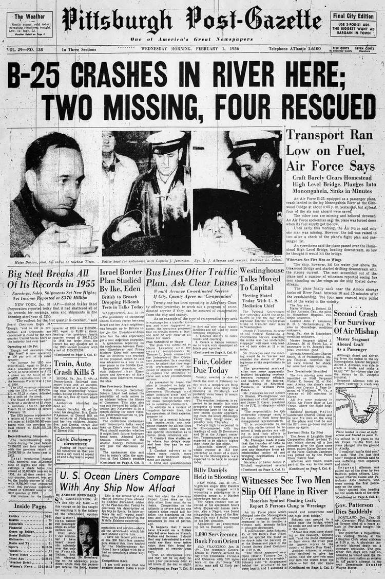 Em 31 de janeiro de 1956, o major William Dotson estava voando em um bombardeiro B-25 Mitchell junto com cinco tripulantes sobre as águas geladas do rio Monongahela, perto de Pittsburgh, Pensilvânia. De acordo com o Heinz History Center, eles estavam em um vôo de treinamento de rotina da Base Aérea de Nellis, em Nevada, para recuperar parques de aeronaves da Base Aérea de Olmstead, em Harrisburg. Por volta das 16h, a tripulação relatou perda de combustível e solicitou pouso no Aeroporto da Grande Pittsburgh. No entanto, mudou para o Aeroporto do Condado de Allegheny quando os níveis de combustível caíram ainda mais. Às 16h11, o suprimento de combustível estava completamente esgotado e o B-25 deslizou sobre a ponte Homestead Grays e fez um pouso forçado no rio Monongahela.