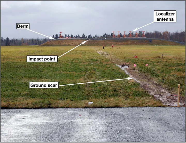 A cauda finalmente levantou do chão, mas o avião seguiu direto para um talude de terra que sustentava o equipamento do sistema de pouso por instrumentos, bem como para uma floresta além.