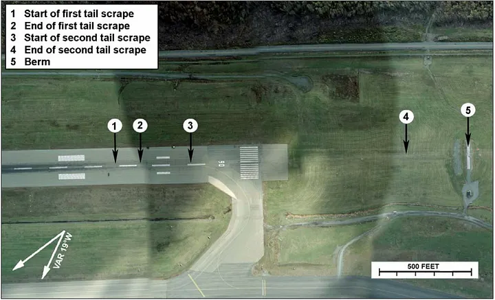 Segundos depois, faltando pouco menos de 800 pés de pista, o piloto voador deve ter percebido que algo estava errado, pois recuou tão bruscamente que a cauda atingiu a pista, arrastando-se pelo asfalto em uma chuva de faíscas.