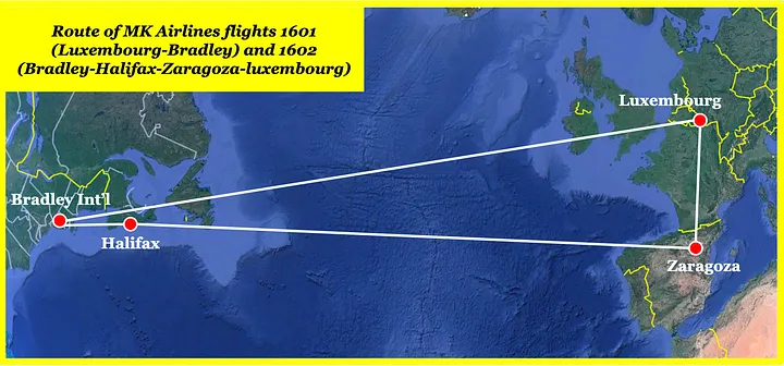 O voo 1602 partiu normalmente e pouco mais de uma hora depois pousou em Halifax, onde taxiou até a rampa para pegar uma carga de vários milhares de quilos de lagostas congeladas. Ao mesmo tempo, levantaram uma grande quantidade de combustível para a viagem transatlântica até Zaragoza. Todas essas informações de peso foram para uma folha de carga compilada pelo loadmaster, que as calculou para chegar a um peso total da aeronave de 350 toneladas métricas (350.000 kg).