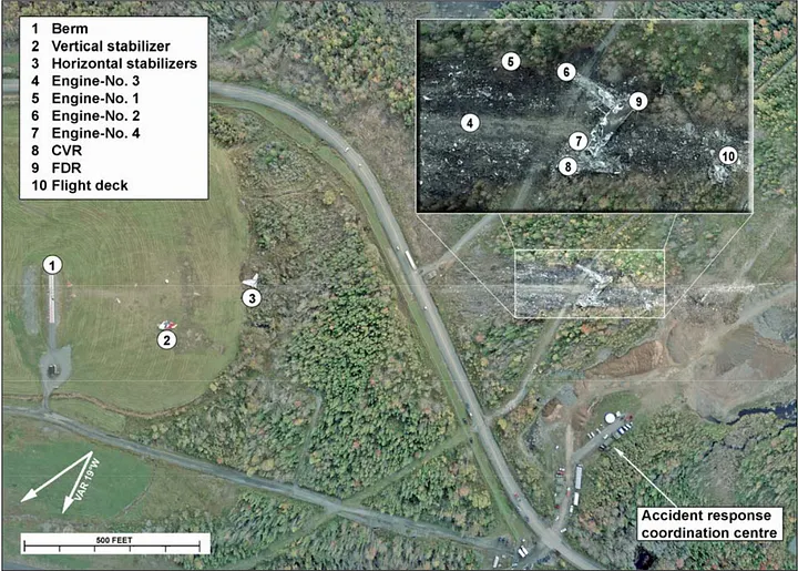 Poucas horas depois do acidente, investigadores do Transportation Safety Board (TSB) do Canadá estavam no local. A primeira prioridade deles era encontrar as caixas pretas do 747, que haviam sido montadas na seção central, acima das asas. Infelizmente, esta foi a área que sofreu mais danos de incêndio e a integridade dos dados contidos nos gravadores estava longe de ser certa.