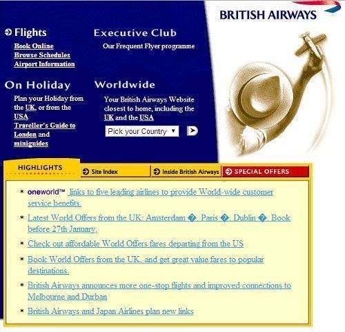 A British Airways foi uma das primeiras companhias aéreas europeias a estabelecer um espaço digital como uma das primeiras a adotar serviços online. O site era principalmente informativo, fornecendo detalhes sobre a companhia aérea, horários de voos e alguns serviços oferecidos pela empresa. Embora não tivesse todos os recursos de reserva online para começar, ele desempenhou um papel crucial no estabelecimento de uma presença online e melhorou o envolvimento do cliente.