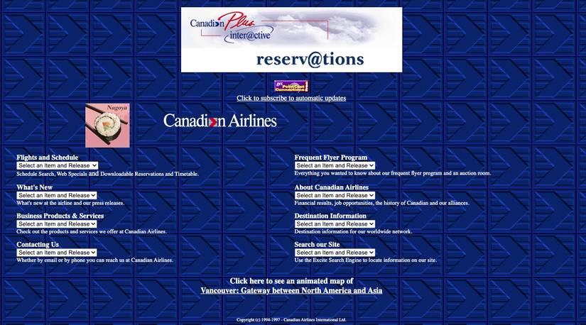 A Canadian Airlines International foi a primeira companhia aérea a lançar um site em 1994, marcando um marco importante na transformação digital da indústria aérea. De acordo com o Travel Update , o site da Canadian Airlines International inicialmente fornecia horários básicos de voos, informações sobre tarifas e detalhes da empresa, preparando o cenário para futuros sistemas de reservas on-line.