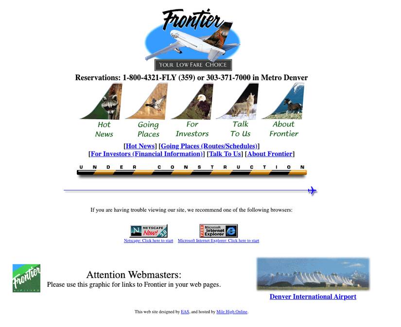 A Frontier Airlines lançou seu site pela primeira vez em 1996, principalmente como uma plataforma informativa para a empresa. Naquela época, ele fornecia detalhes sobre horários de voos, destinos e informações da empresa, mas não tinha a capacidade de os passageiros fazerem reservas. O site tinha a icônica arte da cauda como abas para clicar em vários links, informações do Aeroporto Internacional de Denver e até mesmo uma barra "em construção" que era indicativa de webmasters fazendo alterações no código HTML!
