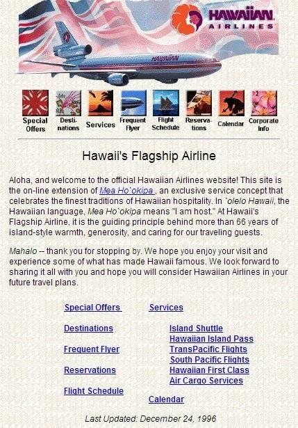 Em dezembro de 1996, a Hawaiian Airlines lançou seu primeiro site focado no cliente, marcando um passo significativo no aprimoramento de sua presença digital. O site forneceu aos viajantes serviços essenciais, como reservas de voos, informações corporativas, ofertas especiais e links convenientes para destinos populares.