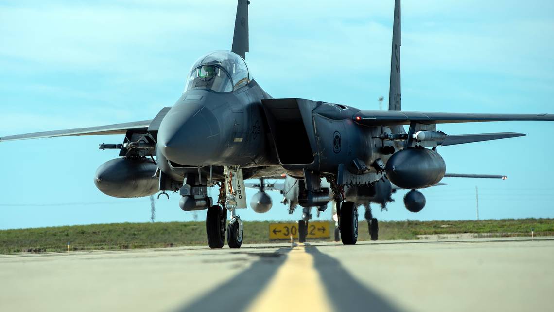Dois F-15E Strike Eagles da Força Aérea dos EUA, designados para a 4ª Ala de Caça, taxiam na
