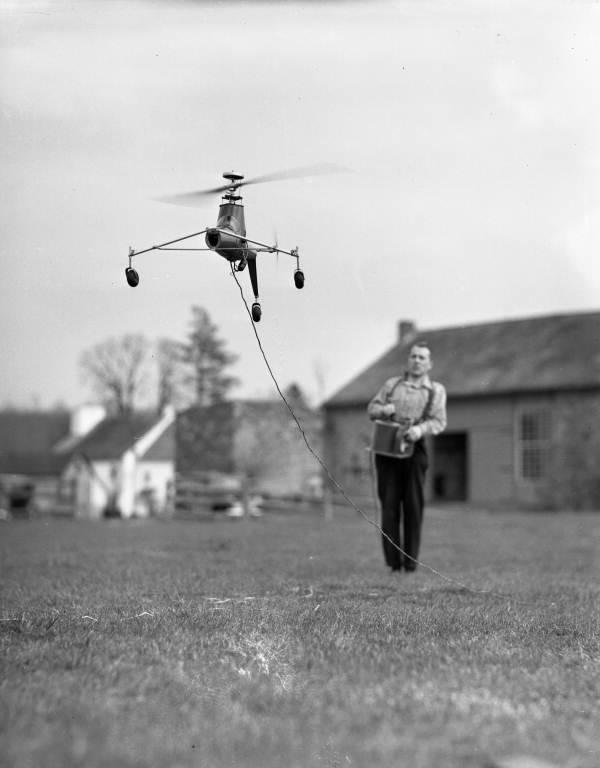 | Modelo de helicóptero sendo controlado por seu criador Arthur M.Young (Foto: Joseph Janney Steinmetz l Memória da Flórida l Wikimedia Commons) |