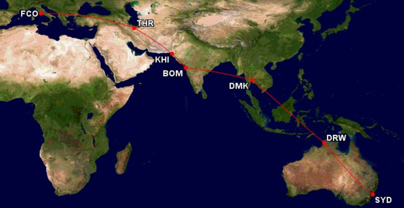 Em 7 de julho de 1962, o voo 771 da Alitalia iria realizar um voo internacional regular de várias etapas de Sydney, na Austrália, para para Roma, na Itália, com escalas em Darwin (Austrália), Bangkok (Tailândia), Bombaim (Índia), Karachi (Paquistão) e Teerã (Irã).