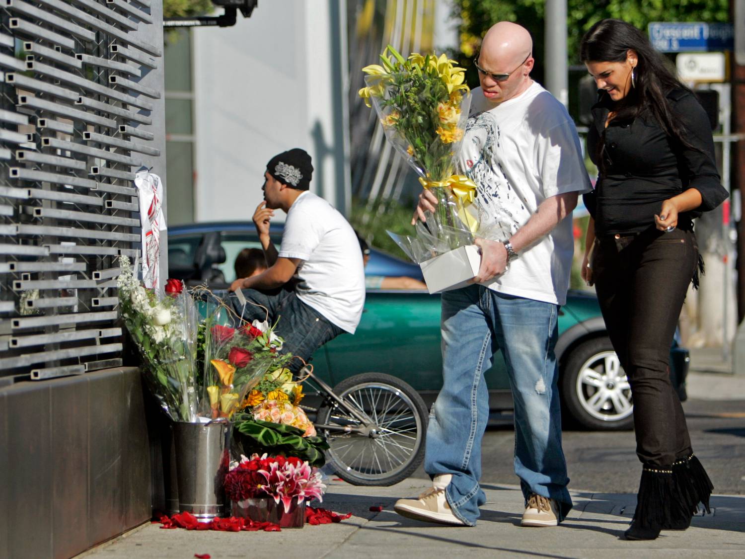 | Fãs deixaram flores do lado de fora da loja de moda Barker's Fast Life em Los Angeles após o acidente |