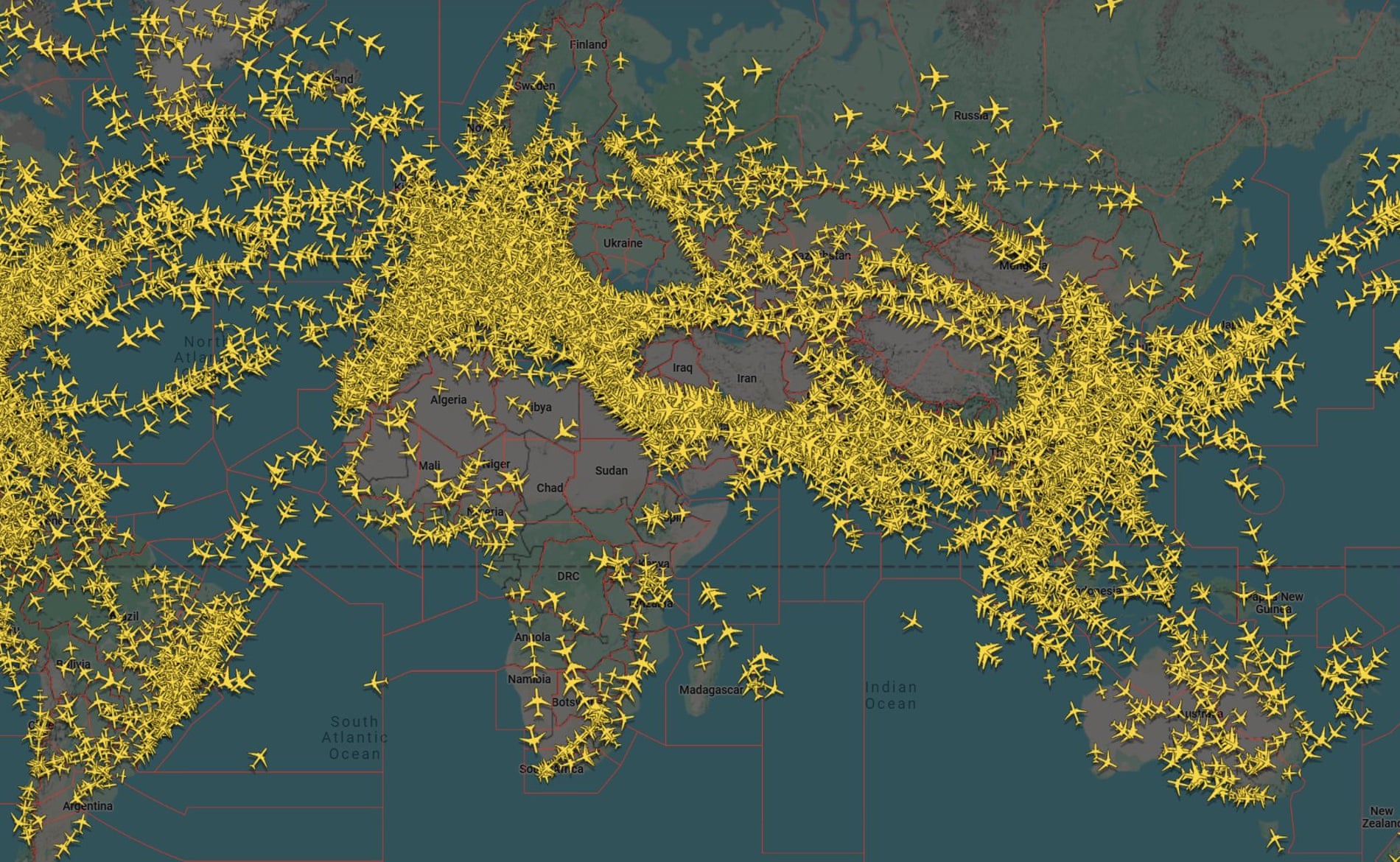 | Uma imagem publicada no X pelo Flightradar24 dizendo "é assim que o tráfego aéreo global está agora", dias após o início do conflito entre Israel e o Irã (Ilustração: Flightradar24) |