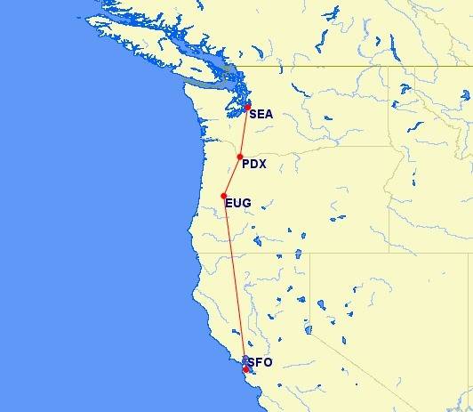 O voo 956 chegou no Aeroporto de Eugene, no Oregon, às 19h34 e partiu para Portland às 19h52, levando a bordo cinco tripulantes e 13 passageiros.