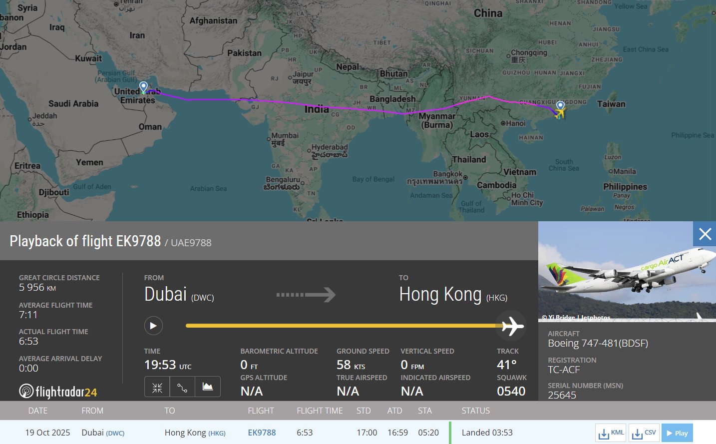 Em 20 de outubro de 2025, o Boeing 747-481 (BDSF), prefixo TC-ACF, da Emirates SkyCargo, operado pela Air ACT (foto abaixo), operava o voo 9788, do Aeroporto Internacional Al Maktoum, nos Emirados Árabes Unidos, para o Aeroporto Internacional de Hong Kong, levando a bordo quatro tripulantes.
