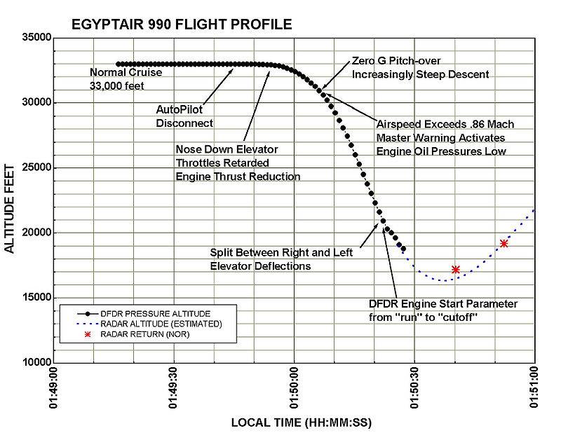 Cerca de 30 segundos depois, Batouti desligou o piloto automático, assumindo o controle manual do avião. Por mais alguns segundos, ele não fez nada. Então ele sussurrou de novo: “Eu confio em Deus”, colocou a potência do motor em marcha lenta e abruptamente inclinou o nariz para baixo a quarenta graus. Com uma rapidez assustadora, o 767 começou a mergulhar em direção ao mar.