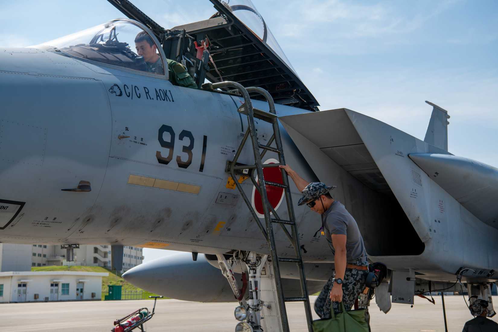 | Um membro da Força Aérea de Autodefesa do Japão auxilia um piloto do F-15J Eagle (Crédito: Força Aérea dos EUA) |