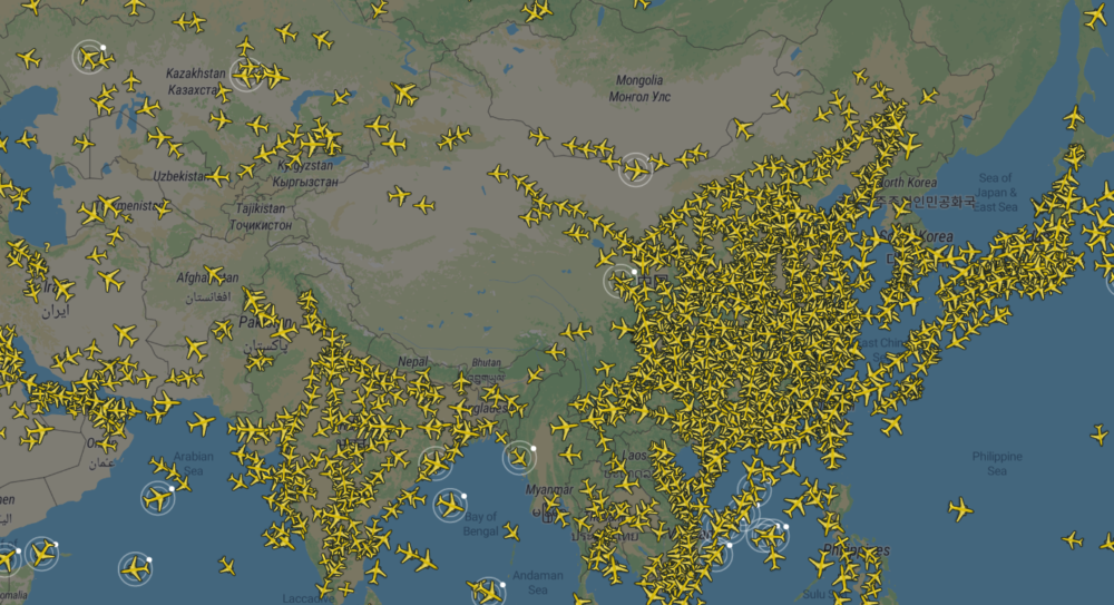 | Voos de e para a Ásia evitando o planalto tibetano (Imagem: RadarBox.com) |