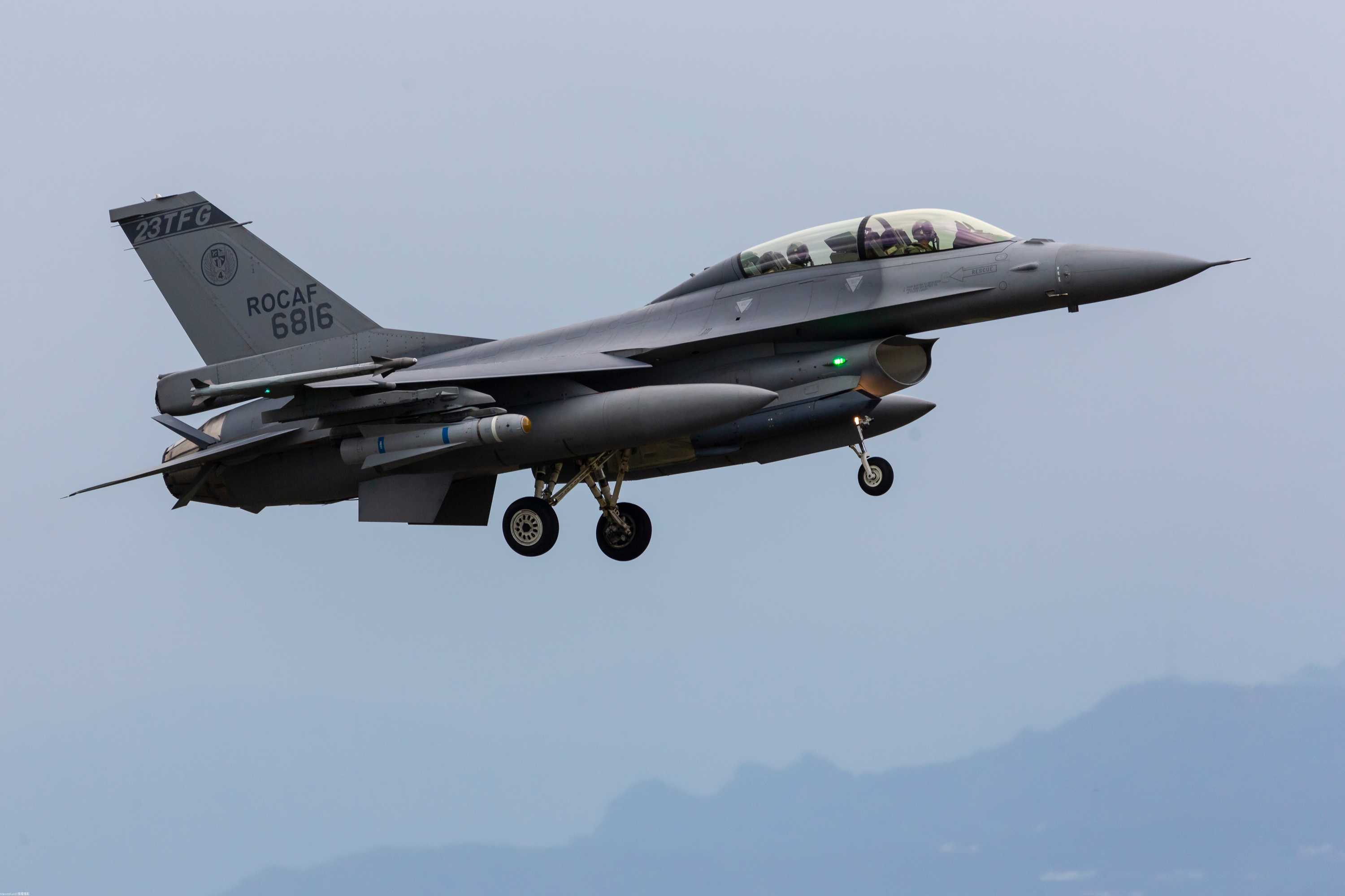 | Um caça a jato F-16BM(V), que pertence à ROCAF, equipado com AAQ-33 Targeting Pod, míssil ar-ar AIM-9X e míssil ar-superfície AGM-65K, pronto para pousar (Foto: ChenHao_Kuo) |