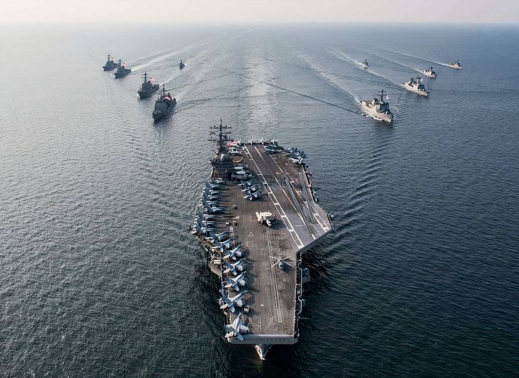 | O porta-aviões USS Ronald Reagan navega em formação com navios do Carrier Strike Group (Foto: Marinha dos EUA) |