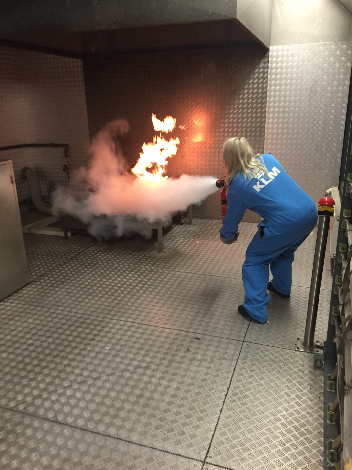 Como parte do exame prático, você deve encontrar fisicamente o fogo e apagá-lo com sucesso. Um dos itens mais recentes é lidar com incêndio em bateria de íon de lítio, uma ocorrência cada vez mais comum. Um membro da tripulação deve ser capaz de recuperar qualquer telefone celular que tenha ficado preso em um assento e usar um saco de contenção de incêndio. O tempo é fundamental; desde a primeira descoberta de um incêndio, serão necessários pelo menos 17 minutos para colocar a aeronave no solo. É uma das situações mais perigosas a bordo e pode rapidamente tornar-se impossível de sobreviver.