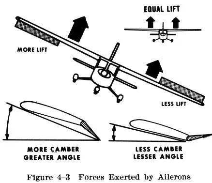 A forma como os ailerons induzem a rotação é aumentando a sustentação em uma asa e, ao mesmo tempo, prejudicando a sustentação na outra. Para conseguir isso, o aileron da asa “para cima” gira para baixo, aumentando a sustentação, enquanto o aileron da asa “para baixo” gira para cima, diminuindo a sustentação.