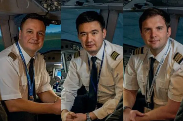| Da esquerda para a direita: Capitão Aushev, Primeiro Oficial Karasholakov e Primeiro Oficial Sokolov |
