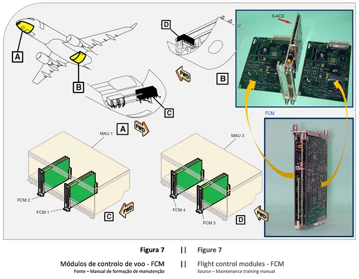 Como você já deve ter adivinhado, esta mensagem significava que havia um problema nos sistemas de controle de voo que impediria o despacho do avião. Contra-intuitivamente, porém, sua ativação foi uma coincidência – cabos de aileron invertidos não são uma das condições de disparo do aviso. De fato, os técnicos da OGMA realizaram alguns trabalhos estruturais que envolveram a remoção temporária de numerosos sistemas da baía de aviónica, incluindo os Módulos de Controlo de Voo (FCMs), os computadores que processam as entradas de controlo de voo para o sistema fly-by-wire. Como resultado, vários erros foram introduzidos, como pinos do conector encaixados incorretamente, que acionaram coletivamente o aviso FLT CTR NO DISPATCH. Portanto, antes que o avião pudesse ser devolvido à companhia aérea, os técnicos resolveram encontrar a causa ou causas do alerta e corrigi-las.